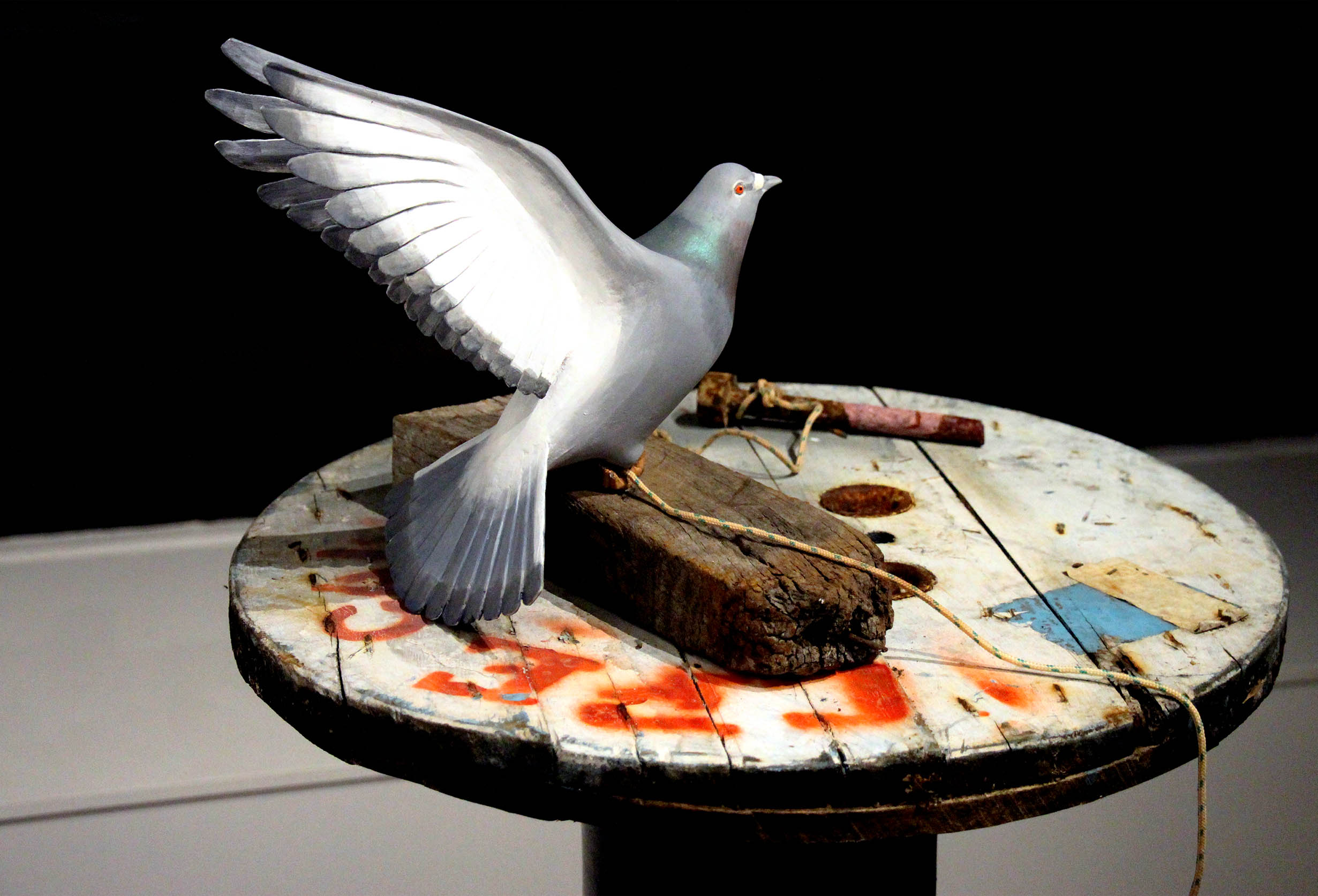 Installation view: #aband0n_all_h0pe, 2016, carved XPS foam, hydrocal, cable reel, salvaged wood and metal from abandoned buildings, acrylic and spray paint, rust dyed utility cord, PETG plastic, wood, dimensions variable.